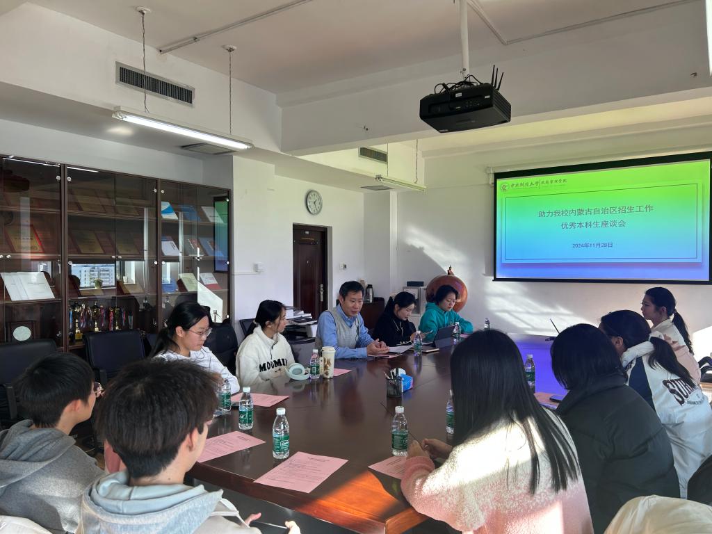 为深入了解公司内蒙古自治区籍员工在校学习生活需求,充分听取大家的意见建议,优化招生宣传工作方案,提升公司在内蒙古自治区招生工作质量,11月28日中午,bv伟德国际1946官网在主教1407会议室召开内蒙古自治区籍优秀本科生座谈会。内蒙古自治区招生宣传组组长、公司党委书记于鹏教授出席会议,教学科研办公室主任喻忱、副主任李想以及来自各公司的9名内蒙籍本科生参加会议。会议由内蒙古自治区招生宣传组副组长、公司党委副书记、纪委书记杨柳老师主持。