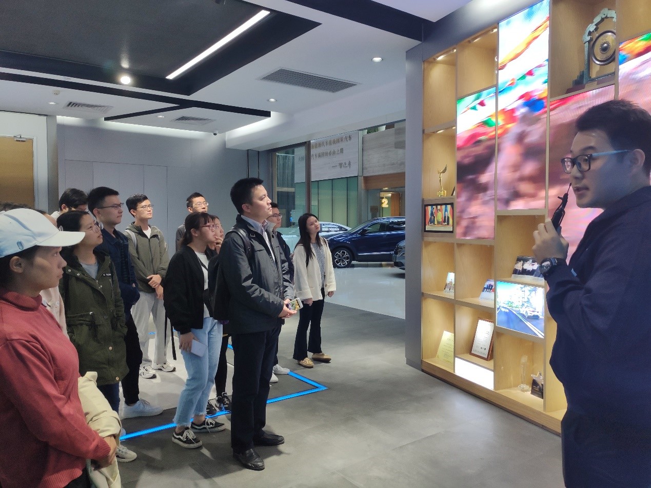 实践教学的第一站来到北汽新能源创新科技研发中心。在科研中心的大厅里,大家首先参观了北汽新能源近年来取得的创新技术成果。北汽新能源自2009年成立至今,紧承国家发展战略要求,在新能源汽车的研发生产方面取得了丰硕成果。目前,北汽新能源纯电动汽车在全国保有量超过了40万辆,初步搭建起首家由整体企业主导的充换电生态体系,在充换电模式升级、电池续航里程提升等方面的研发水平都位居世界前列。