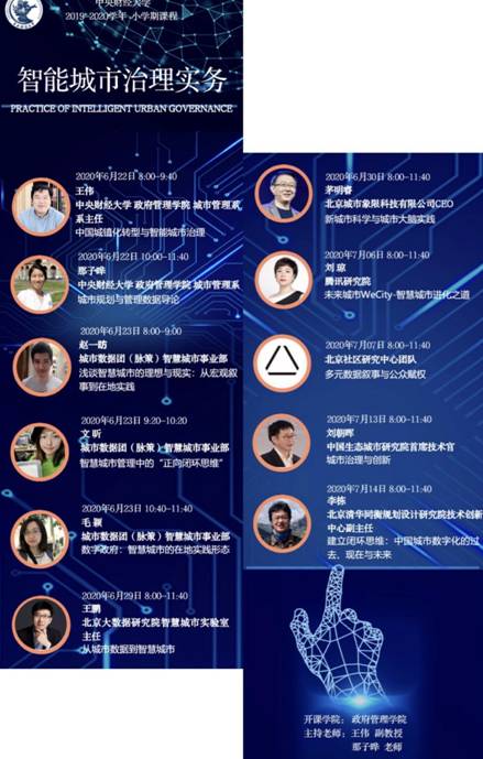 按照课程安排,6月29-7月14日,将陆续有北京大数据研究院智慧城市实验室、北京城市象限科技有限公司、腾讯研究院、北京社区研究中心、中国生态城市研究院、北京清华同衡规划设计研究院等企事业单位的专家与院内教师共同为同学们带来智能城市治理的课程盛宴!