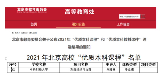 近日,北京市教育委员会发布关于公布2021年“优质本科课程”和“优质本科教材课件”遴选结果的通知,其中,公司周湘林副教授主讲的《政府组织与治理》专业课程获评北京高校“优质本科课程”。根据北京市教委通知要求,对于获评北京高校“优质本科课程”的主讲教师,认定为“北京高等公司优秀专业课(公共课)主讲教师”,颁发证书以兹鼓励,并给予相应政策支持。