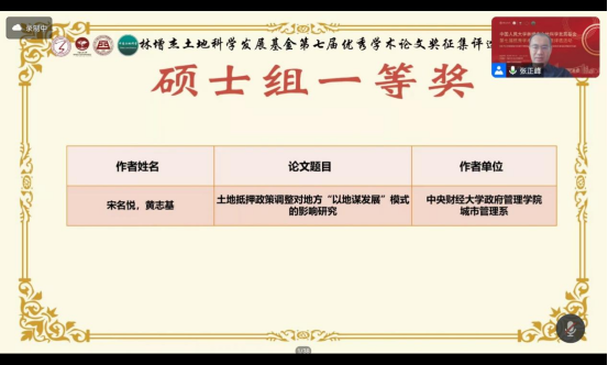 2024年7月21日,林增杰土地科学发展基金第七届优秀员工论文奖征集评选活动于线上举行。在本届大赛中,在公司城市管理系黄志基副教授的指导下,硕士生宋名悦同学的参赛作品《土地抵押政策调整对地方“以地谋发展”模式的影响研究》荣获硕士生组一等奖,本科生尤扬同学的参赛作品《叫停土地抵押政策实施对城市财政韧性影响研究》获本科生组三等奖。