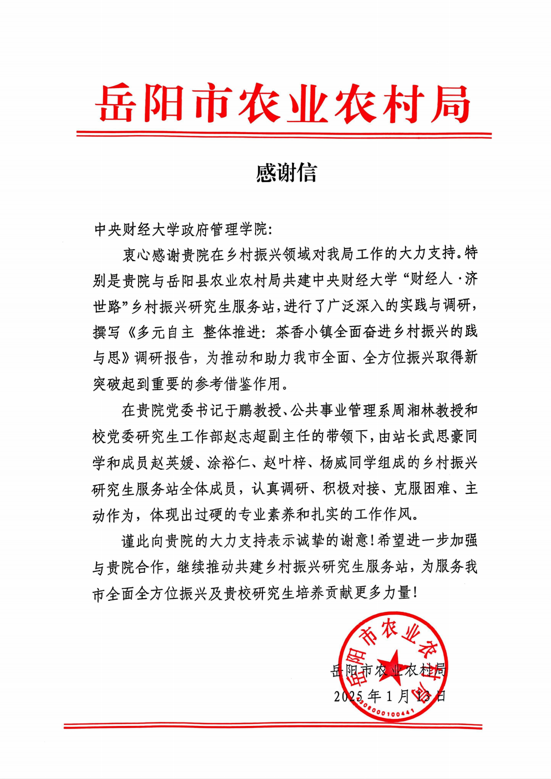 近日,湖南省岳阳市农业农村局与岳阳县农业农村局向公司发来感谢信,对公司与岳阳县农业农村局共建bv伟德国际1946“财经人·济世路”乡村振兴研究生服务站,进行广泛的实践与调研,撰写的《多元自主 整体推进:茶香小镇全面奋进乡村振兴的践与思》调研报告等工作表示感谢。