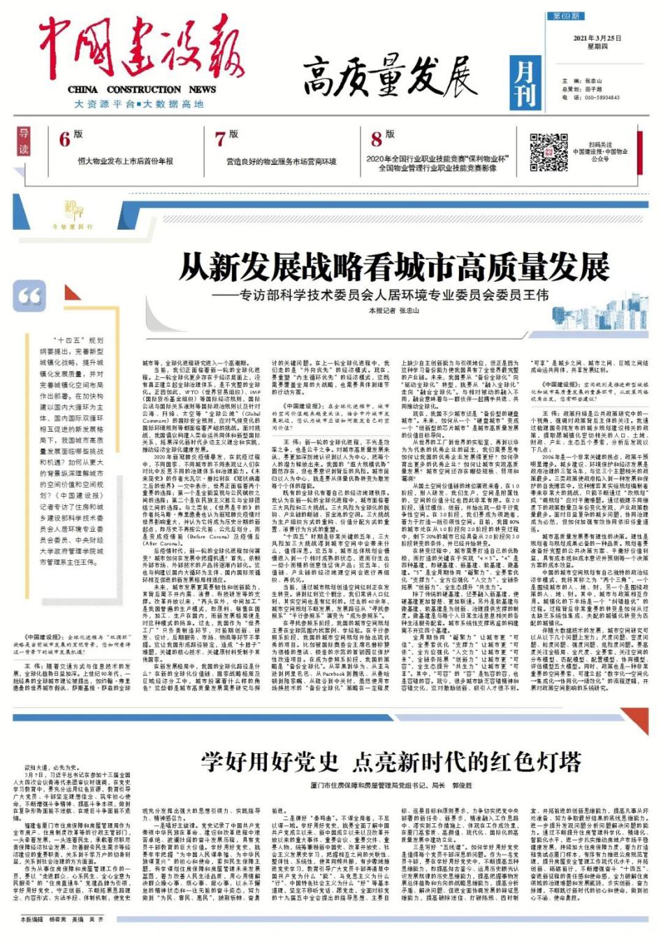 “十四五”规划纲要提出,完善新型城镇化战略,提升城镇化发展质量,并对完善城镇化空间布局作出部署。在加快构建以国内大循环为主体、国内国际双循环相互促进的新发展格局下,我国城市高质量发展面临哪些挑战和机遇?如何从更大的背景纵深理解城市的空间价值和空间规划?对此,公司城市管理系主任王伟副教授接受了《中国建设报》记者采访。