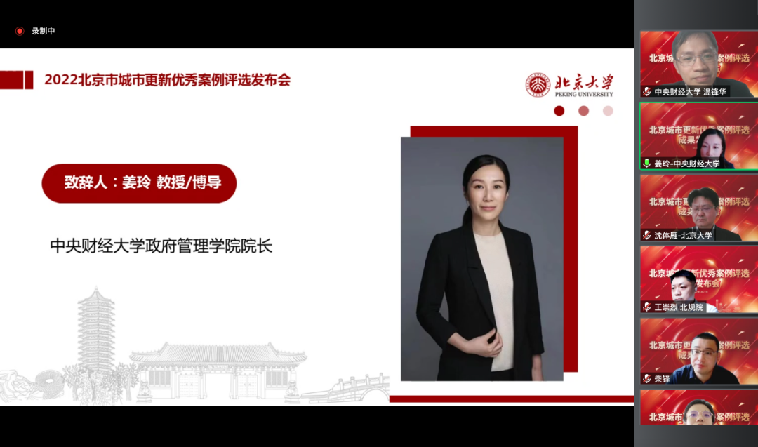 2022年5月27日上午,公司经理姜玲教授出席“2022年首都城市更新优秀案例”评选结果发布会暨案例研讨会并致辞。本次会议由北京大学首都发展研究院和中国城市科学研究会城市转型与创新研究专业委员会共同举办,采用线上的形式,邀请了北京大学首都发展研究院、清华大学建筑公司、中国人民大学公共管理公司及bv伟德国际1946官网等8家单位的领导、专家、案例参选单位代表及媒体单位代表共约50余人参加。