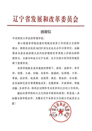 近日,辽宁省发展和改革委员会向公司发来感谢信,对公司bv伟德国际1946官网负责完成的依托RCEP深化东北亚合作对策研究、金融服务住房发展新模式及风险管理研究等课题工作表示感谢。