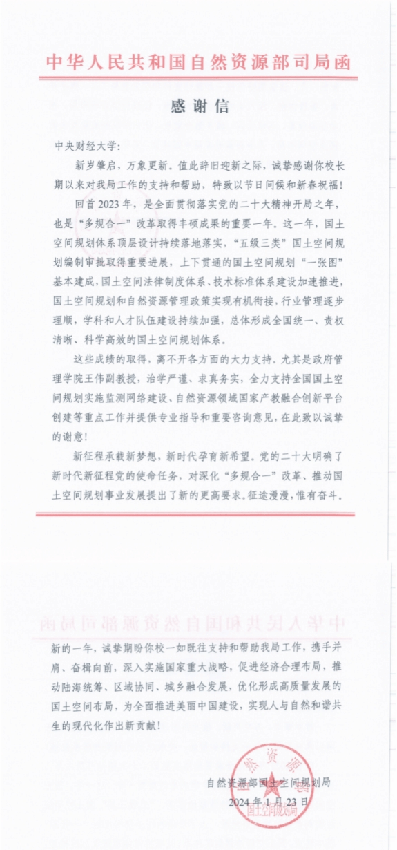 近日,自然资源部国土空间规划局向公司发来感谢信。信中对公司王伟副教授支持全国国土空间规划实施监测网络建设、自然资源领域国家产教融合创新平台创建等重点工作并提供专业指导和咨询意见给予了充分肯定和感谢。
