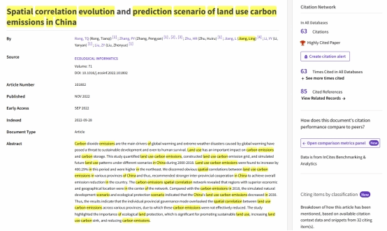 最近,根据科睿唯安(Clarivate Analytics)Essential Science Indicators(ESI)2024年5月公布的最新统计结果,公司姜玲教授(通讯作者)在国际知名学术期刊Ecological Informatics上发表的研究论文《Spatial correlation evolution and prediction scenario of land use carbon emissions in china》入选ESI全球Top 1%高被引论文。其中Web of Science库引用63次。