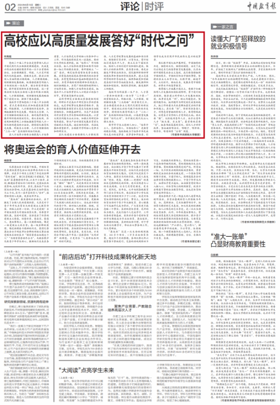 8月13日,《中国教育报》刊登公司教授何秀超(北京市习近平新时代中国特色社会主义思想研究中心特约研究员)署名文章《高校应以高质量发展答好“时代之问”》。文章指出,高校学习贯彻党的二十届三中全会精神,重点是要深刻认识加快建设教育强国、科技强国、人才强国的历史使命,准确把握教育优先发展、科技自立自强、人才引领驱动的相互关系。面对高等教育发展外部环境的深刻变化,要从系统观、历史观和规律观三方面把握教育科技人才一体化协同建设的方法论,持续深化教育优先发展、科技自立自强、人才引领驱动的“三位一体”良性循环的运行机制。