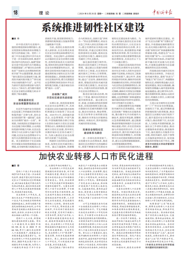 8月26日,《中国城市报》理论版刊登公司姜玲教授署名文章《系统推进韧性社区建设》。文章指出,在中国式现代化进程中,基层治理是国家治理的基石,是实现国家治理体系和治理能力现代化的基础工程。系统推进韧性社区建设需要提高基层社区安全治理重要性的认识、总结推广减灾示范社区建设先进经验、完善安全韧性社区建设体系与路径。