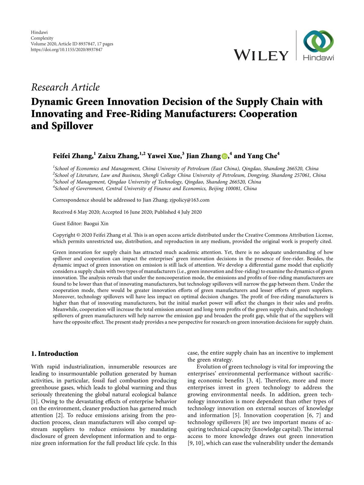 近日,公司本科生车洋作为共同作者在SCI期刊Complexity(JCR Q1期刊)发表学术论文,题目为“Dynamic Green Innovation Decision of the Supply Chain with Innovating and Free-Riding Manufacturers: Cooperation and Spillover”。该论文分析了在“搭便车”企业存在的情况下,创新溢出效应和合作效应会如何影响企业的绿色创新决策,为绿色技术创新政策设计与企业决策研究提供了新的视角。
