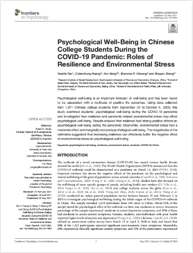 近日,公司耿云副教授以通讯作者在Frontiers in Psychology第12卷发表学术论文,题目为Psychological Well-being in Chinese College Students During the COVID-19 Pandemic: Roles of Resilience and Environmental Stress.