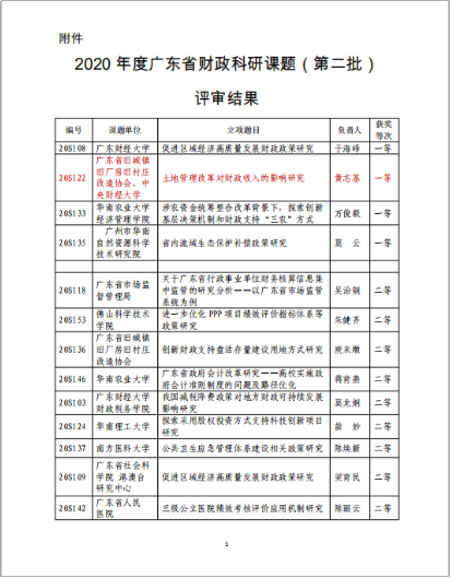 近日,广东省财政厅公布了2020年度广东财政科研课题结项评审结果的通知,评选出一等奖课题4个、二等奖课题11个、三等奖课题37个。公司黄志基副教授承担的课题《土地管理改革对财政收入的影响研究》获得了一等奖。