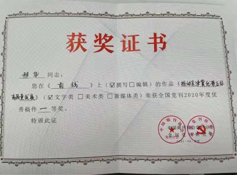 公司邢华教授国家社科基金一般项目《跨域合作治理中的府际关系研究》研究成果《推动京津冀优势互补高质量发展》荣获全国党刊2020年度优秀稿件一等奖。