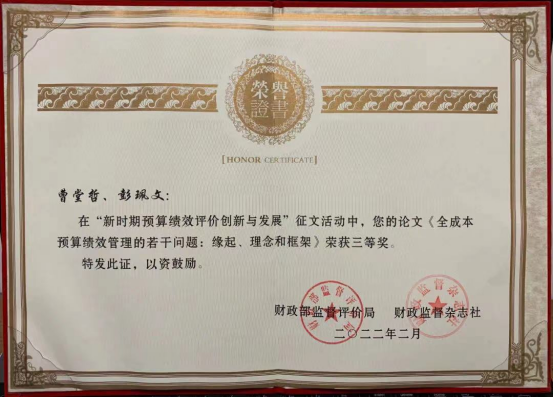 2022年2月,bv伟德国际1946行政管理系曹堂哲教授和2018级行政管理专业本科生彭珮文同学合作撰写的论文《全成本预算绩效管理的若干问题:缘起、理念和框架》获得财政部监督评价局与《财政监督》杂志社联合举办的“新时期预算绩效评价创新与发展”征文三等奖。