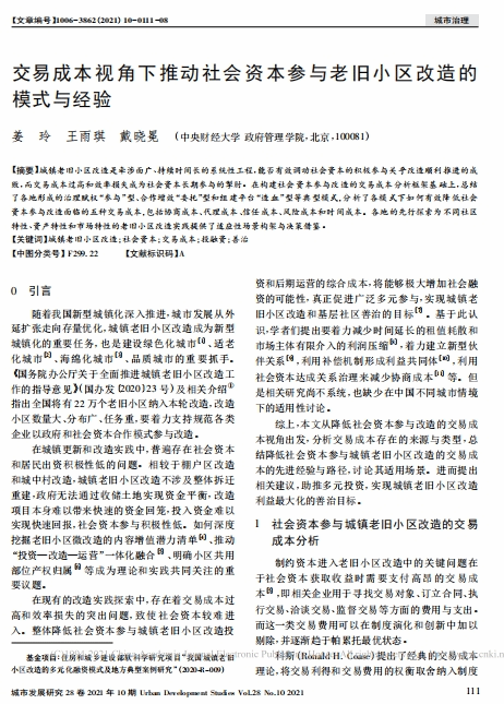 近日,公司姜玲教授与本科生王雨琪、戴晓冕在《城市发展研究》发表学术论文,题目为《交易成本视角下推动社会资本参与老旧小区改造的模式与经验》。