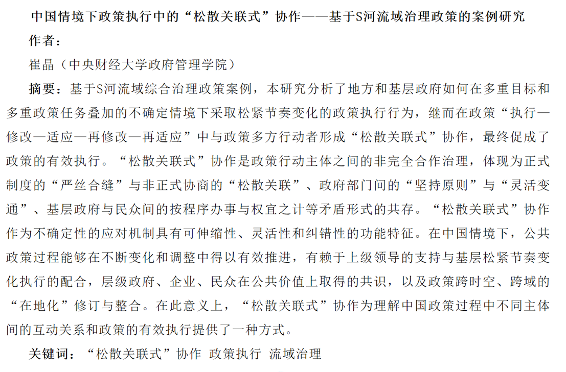 近日,公司崔晶教授在核心期刊《管理世界》上发表学术论文,题目为《中国情境下政策执行中的“松散关联式”协作——基于S河流域治理政策的案例研究》。