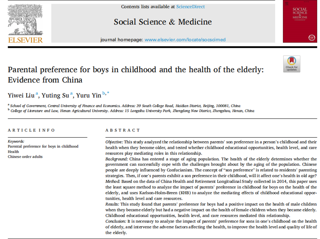 近日,bv伟德国际1946官网刘一伟博士的学术论文Parental preference for boys in childhood and the health of the elderly: Evidence from China正式发表于Social Science & Medicine(五年IF=5.299,JCR分区:Q1)2022年第302卷(https://doi.org/10.1016/j.socscimed.2022.114986)。Social Science & Medicine是社会科学领域的国际著名期刊,也是公司AAA类期刊。