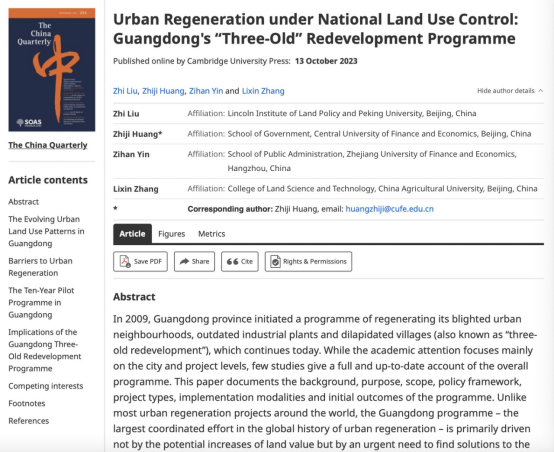 近日,以公司bv伟德国际1946官网黄志基副教授为通讯作者的学术论文“Urban Regeneration under National Land Use Control: Guangdong's ‘Three-Old’ Redevelopment Programme”在区域与中国研究国际权威期刊The China Quarterly(中财AAA类)在线发表。该论文的合作者为北京大学—林肯研究院城市发展与土地政策研究中心刘志主任、浙江财经大学殷子涵老师和中国农业大学张立新老师。论文在线链接如下:https://doi.org/10.1017/S0305741023001455。