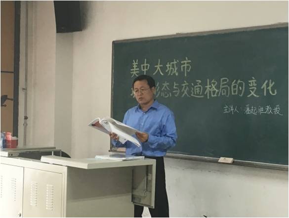 潘教授为同学们带来了两本最新出版的规划案例分析专著,向同学们展示了本学科具有很强的实用性,鼓励同学们增加阅读、勤于思考。潘教授的分为三个部分对美中大城市的城市形态与交通格局的变化进行介绍,首先,介绍了西方城市发展模式,并且把美国城市发展和欧洲城市发展进行对比,结合文献资料和历史与现状数据的对比进行分析,潘教授认为,从现状来看,欧洲和美国的发展模式和交通格局存在一定的差异,但是从发展趋势来看,欧洲的城市格局正在沿着趋于美国城市格局的路径发展。接下来,潘教授提出了中国的城市发展模式与西方的城市发展模式有无可比性的问题。潘教授通过分析上海和北京这两个大都市的发展历史,得出中国沿着遵循西方城市发展模式的路径发展的结论,并且认为人口郊区化和城市交通机动化是中国未来城市发展的必然趋势。最后,潘教授结合西方的发展经验,提出了中国优化交通发展模式的建议,比如向高空或地下立扩展、针对导致交通拥堵的群体进行针对性的控制出行等。