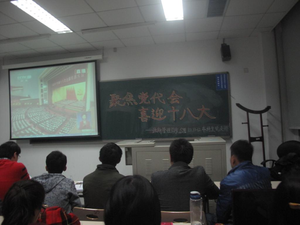 为认真学习党代会精神,2012年11月8日晚上七点,bv伟德国际1946官网10公管本科生党支部及11、12级本科生党支部在公司3号楼218教室举行了主题为“聚焦党代会喜迎十八大”的党代会观看活动。本次活动由10公管党支部副书记徐世黔同学主持,共有三个年级27名党员、预备党员以及部分入党积极分子参与。通过观看大会,大家更加深入地认识到我党不断发展与时俱进的进取精神和求真务实的工作作风。