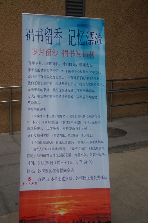 “青年岁月,璀璨夺目;沙河时光,斑斓成长;带不走的书籍是搁浅的回忆。2011级将于8月搬离沙河校区,沙河三年的老员工涯带来了很多美好的经历,也有沉甸甸的书籍……”这是2014年6月25日政管11本科生党支部和沙河园区党员先锋队开展的“捐书留香·记忆漂流---岁月留沙 捐书发福利”活动的宣传单节语。