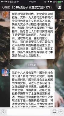 本次线上学习交流会由支部书记朱洁主持,借助移动交流平台的便利,党支部全体16名成员积极参与其中。朱洁表示,学习党的十九大报告,支部近期最重要的政治任务。对于报告精神的领悟,各位党员要内化于心,外化于行。学习交流的目的既在督促,又在提升。各位党员要深刻认识学习活动的意义,不断加深对于报告精神的学习与领悟。