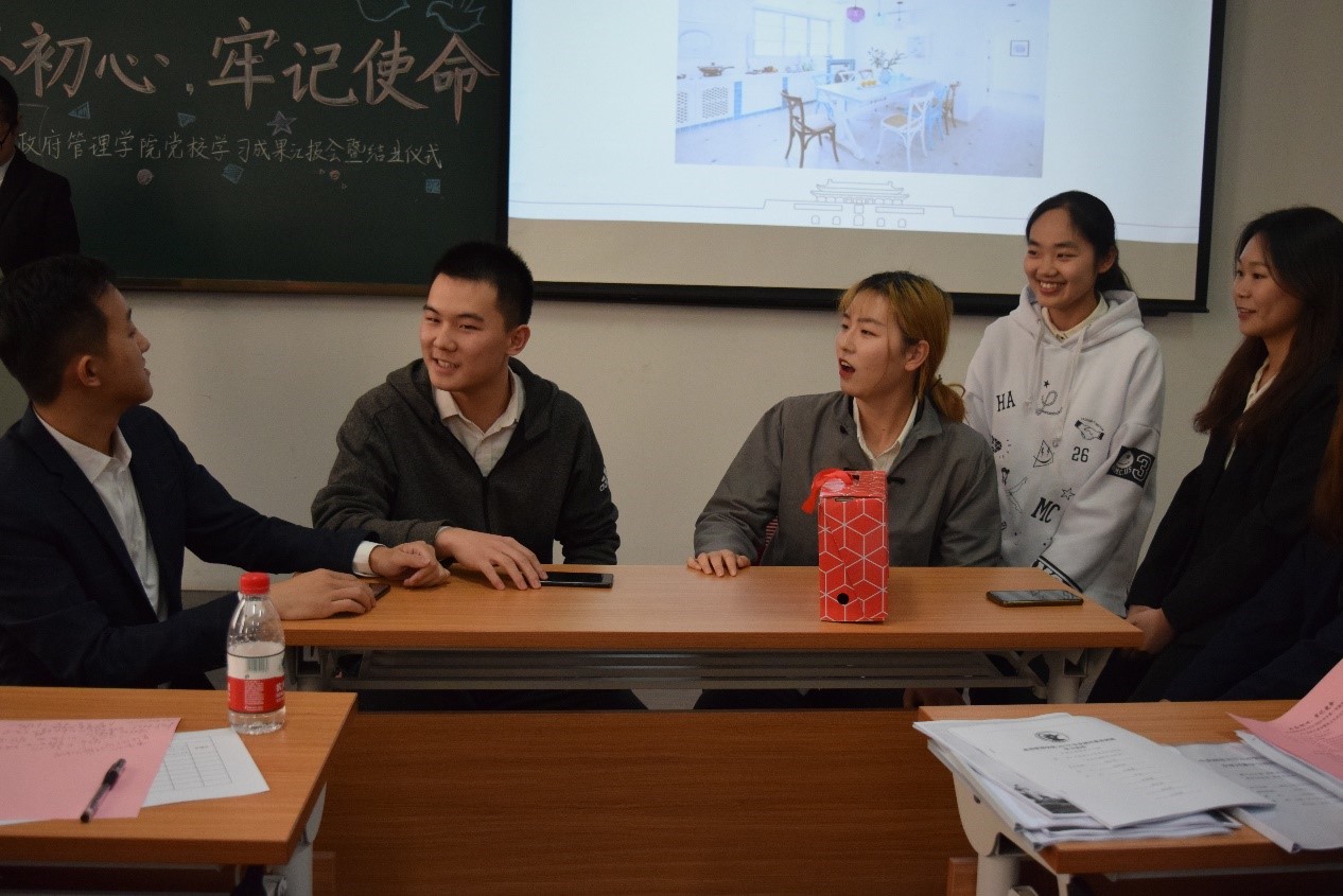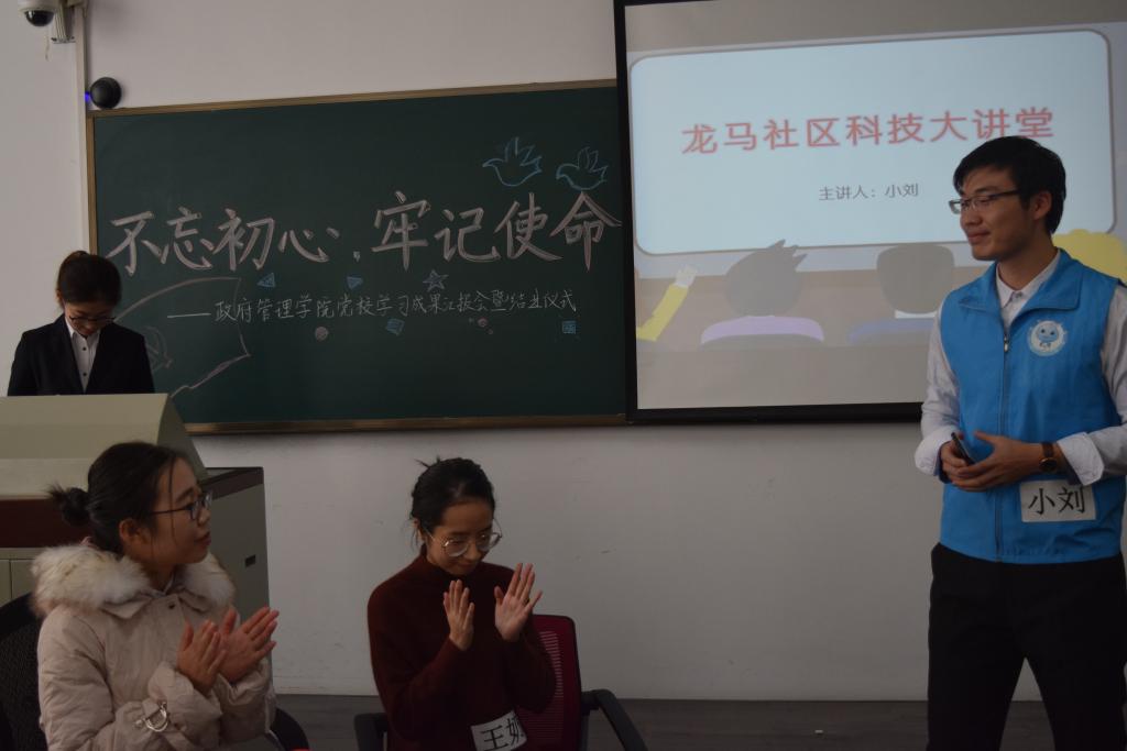 第一小组的同学们深入学习党的十四届四中全会精神,以“坚持和完善人民当家作主体系,发展社会主义民主政治”为切入点,重点研究了健全基层群众自治制度这一方面内容,并提出相关建议。第一小组带来情景剧“龙马社区那些事”,剧中党员小刘耐心教授老年人使用智能手机,以推广社情民意网络渠道,推动基层群众参政。精彩表演获得老师与同学们的热烈掌声。