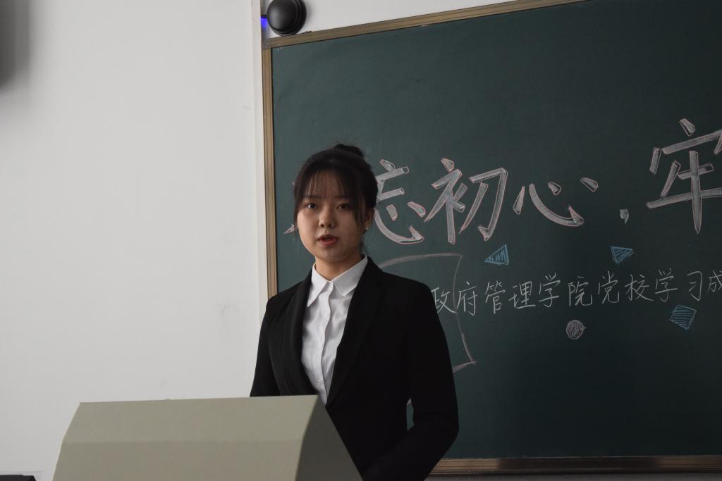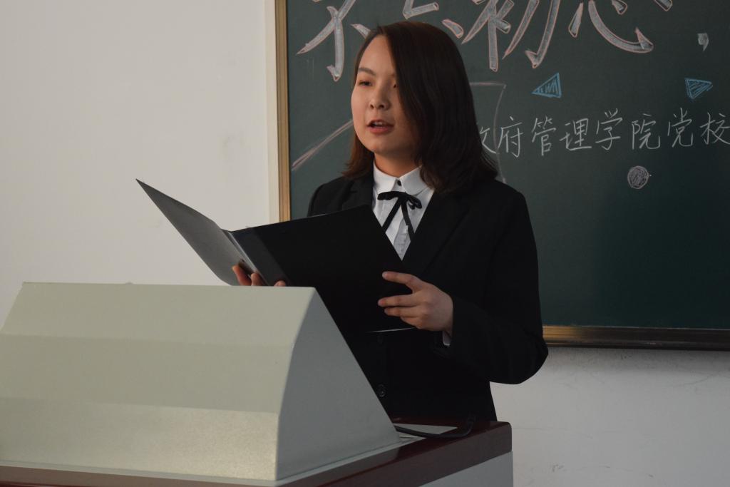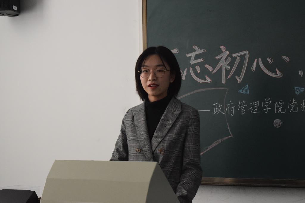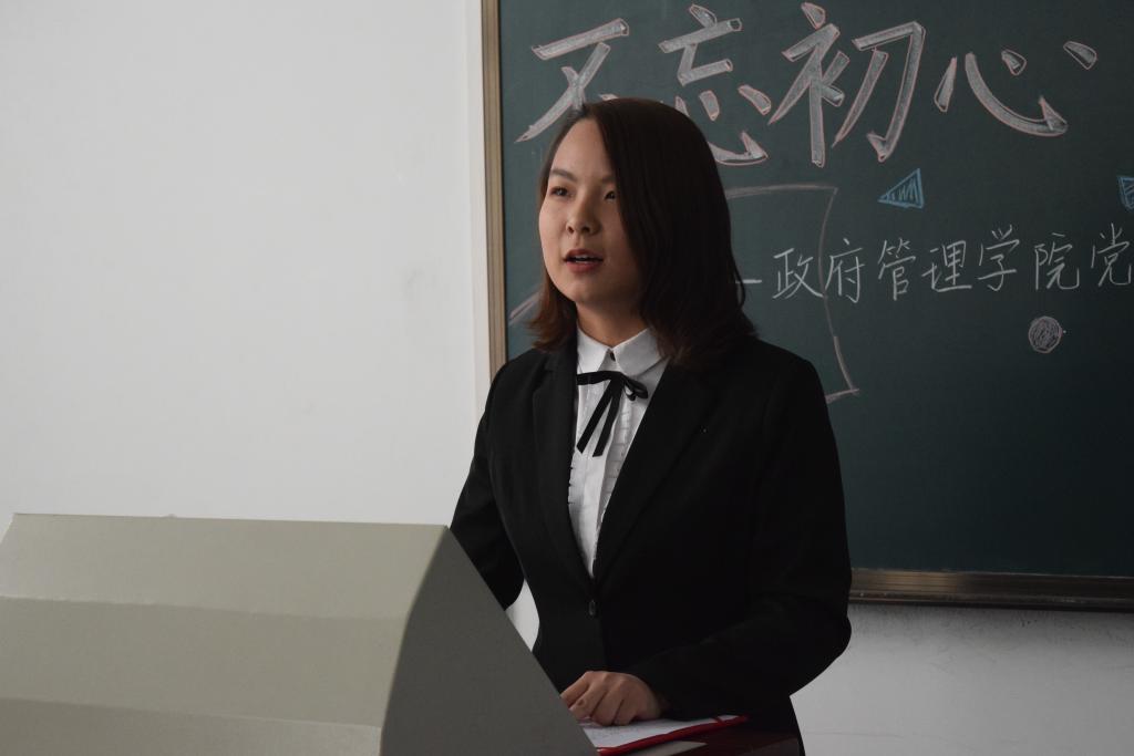 随后,入党积极分子员工代表付禛婧同学上台发言。回忆自己的学习经历,付禛婧感慨中国共产党一路走来充满挑战与艰辛,但共产党人永远坚守内心,始终保持战斗姿态。时代的接力棒已经交到青年人手上,我们生逢盛世,应有信心和能力去实现中华民族伟大复兴。作为中财政管人,作为入党积极分子,共产党的接班人,我们要秉上善若水之志,乘正气浩然之德,保持为中华之崛起而读书的治学初心,胸怀天下格局,关心国家未来,担责任、敢作为、做实事。付禛婧愿同大家一起继续上下求索、秉持初心,成为一名合格的共产党人。