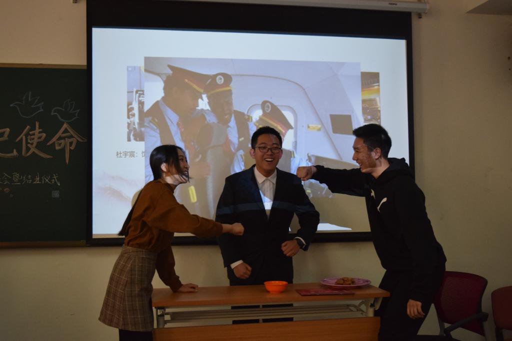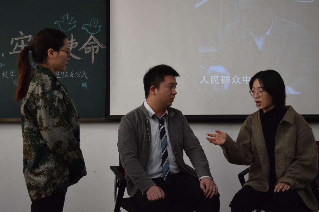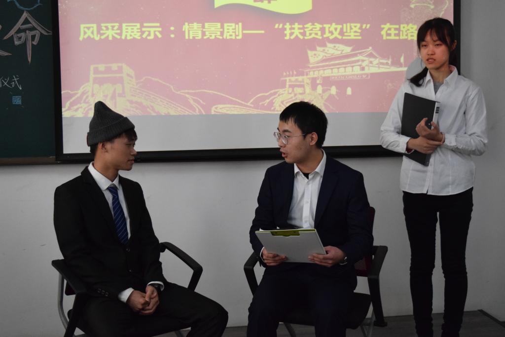 第三小组成员学习研究习主席多次关于“我将无我,服务人民”的讲话与采访,深入研究青年习近平关于 “无我”的论述及如何才能保持“无我之大格局”的讲解。小组成员高度还原《人民的名义》中的经典片段,老检察官陈岩石坚持从老百姓的利益出发,誓死保卫人民利益的精神使人震撼。之后,小组成员以一首原创诗朗诵结束展示,全体成员高呼“我将无我,不负人民”的口号,筑牢为人民服务的崇高理想信念。