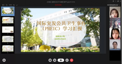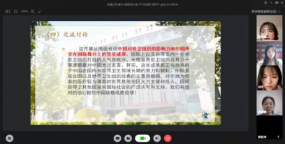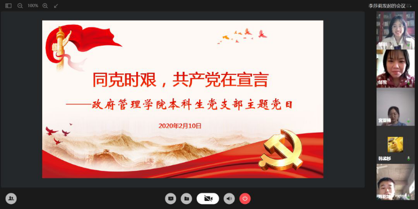 活动伊始,同学们透过自己的电脑或手机,共同起立,唱响国歌。支部书记李莎莉向支部内2位湖北籍党员及全院17位湖北籍同学问好。现居湖北宜昌的邹玥表示日常生活很平顺,一切都好,请大家放心;湖北汉川的邹雪表示,虽然疫情每天通报的数字都在变化,但是,我们有信心一切向好。