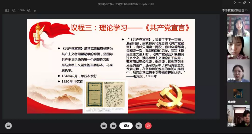 毛泽东同志1939年时曾说“《共产党宣言》,我看了不下一百遍,遇到问题,我就翻阅马克思的《共产党宣言》,有时只阅读一两段,有时全篇都读,每阅读一次,我都有新的启发。”本次主题党日活动前,支部同学自主阅读、学习《共产党宣言》,共形成阅读笔记、思想汇报等42篇。力图在当下抗击疫情的艰难时刻,将这个文本透过172年的历史,透过资本主义三个阶段的发展,透过社会主义的实践,和当下我们所关注、面临的现实问题相关联。我们从中看到的是它所讲述的未来,这个未来是要我们去博弈的,我们如何介入历史的生成,如何介入社会的改变,那么未来就会以何种方式被安顿、被展开。