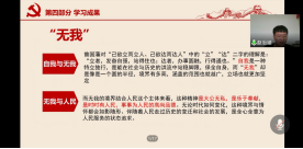 “大道之行也,天下为公。”“大道之行”小组在线下通过小组交流讨论、学习《之江新语》、观看红色电影、学习抗疫英雄事迹等方式进行深度学习。学员们认为“大道之行”提现了习主席“我将无我,不负人民。”的精神境界。在理论学习的基础上,学员们探讨了“自我”、“无我”、“人民”不同,总结性地提出:“无我”是新时代中国共产党人人格的鲜明价值取向,作为向党组织靠拢的积极分子,我们要培养“牺牲小我,成就大我”的精神,追求“无我”的境界。