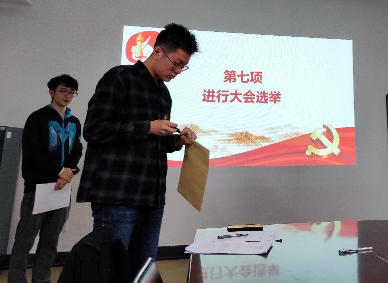 由总监票人张栋同志主持选举bv伟德国际1946官网本科生党支部新一届委员会委员。本次选举发放选票8张,有效选票8张,李莎莉同志获赞成票7票,陈建军同志获赞成票7票,严其姝同志获赞成票4票,王文昊同志获赞成票6票。大会选举李莎莉、陈建军、王文昊三位同志为支部委员,选举结果有效。