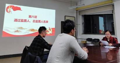 会议第五项,经党员推选,党支部审议,提出张栋、李雨书同志为大会选举的监票人建议人选,建议张栋担任总监票人,表决一致通过监票人、总监票人名单。同时,按照规定,由支部指定计票人,计票人为李鸿斌。