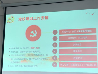 会议第二项,张小林老师介绍党校培训教学安排。本次党校培训教学安排包括在线学习、课堂教学、实践环节、理论自学、讨论交流、学习心得六个环节。其中,学员将被划分为6个党史学习教育研习小组,按照规定任务选定探究主题,形成专题报告并进行终期汇报。