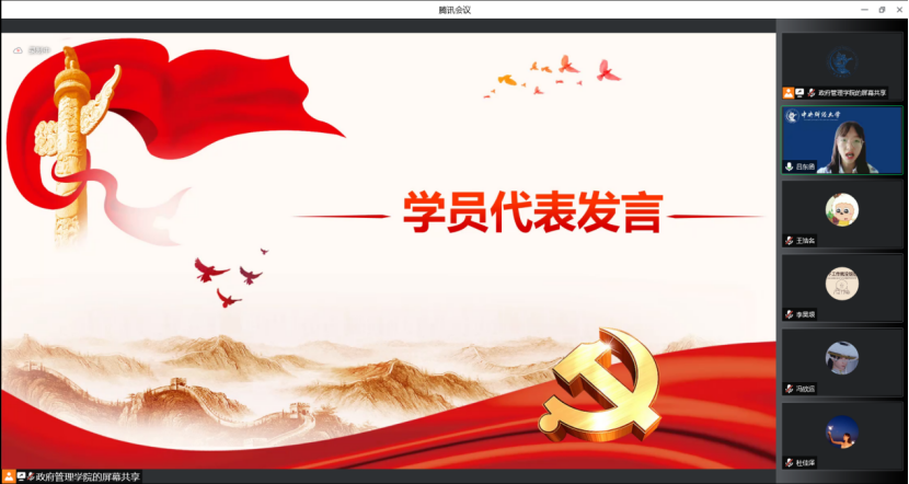 会议第三项,学员代表城市管理20吕东函同学发言。吕东函同学通过回顾党的百年历程、感慨如今光辉成就以及体悟青年使命担当,与大家分享了自己对于中国共产党本心的理解感悟——赓续红色血脉之心、坚定理想信念之心、践行青年担当之心。吕东函同学表示作为一名新时代青年老员工应当赓续红色血脉、坚定理想信念、践行青年担当,同时与同学们共勉,为成为一名光荣的共产党员而砥砺奋进。