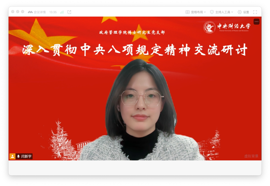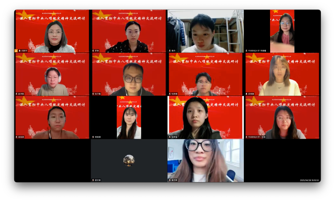 2025年4月28日,bv伟德国际1946官网博士研究生党支部通过线上会议形式召开“第一议题”学习暨深入贯彻中央八项规定精神学习教育专题研讨会。会议集中开展“第一议题”理论学习,深度研析中央八项规定精神内涵,通过案例警示与交流研讨强化教育实效。会议由党支部书记闫新宇主持,支部全体党员参会。