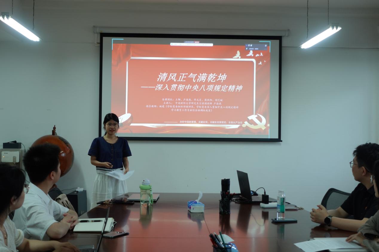 为扎实开展深入贯彻中央八项规定精神学习教育,强化党员理论武装,在公司党委的统筹安排下,公司4个研究生党支部通过集体学习、专题研讨、交流分享等多种形式,不断深化对中央八项规定精神及其实施细则的理解与认识,全体党员在政治素养和纪律意识方面有了显著提升。在此基础上,2025年5月15日,bv伟德国际1946官网博士研究生党支部、学术型硕士研究生第一党支部、学术型硕士研究生第二党支部和MPA党支部于主教1407共同举办了理论联学共建活动,活动由博士研究生党支部书记闫新宇主持,研究生宣讲团讲师卢海燕作主题宣讲。