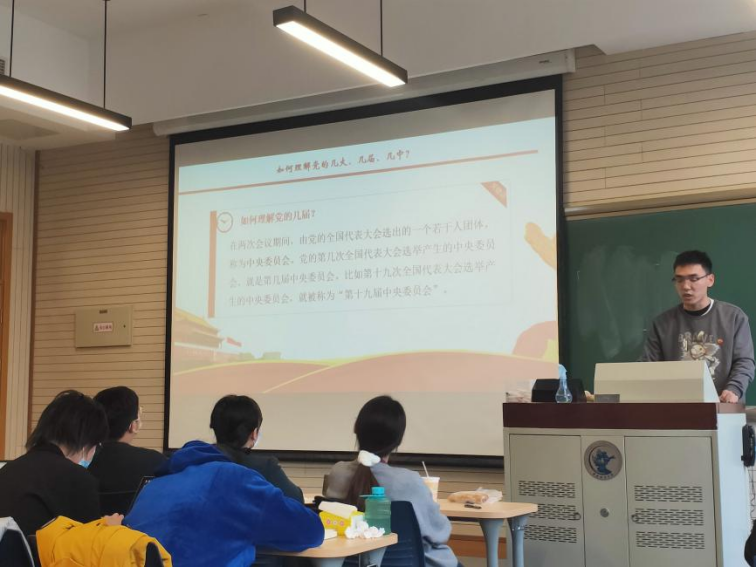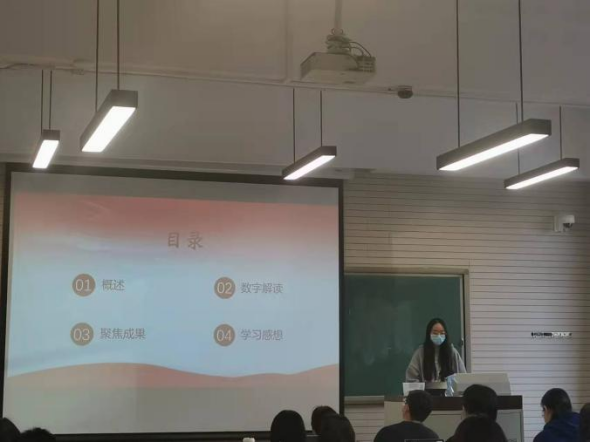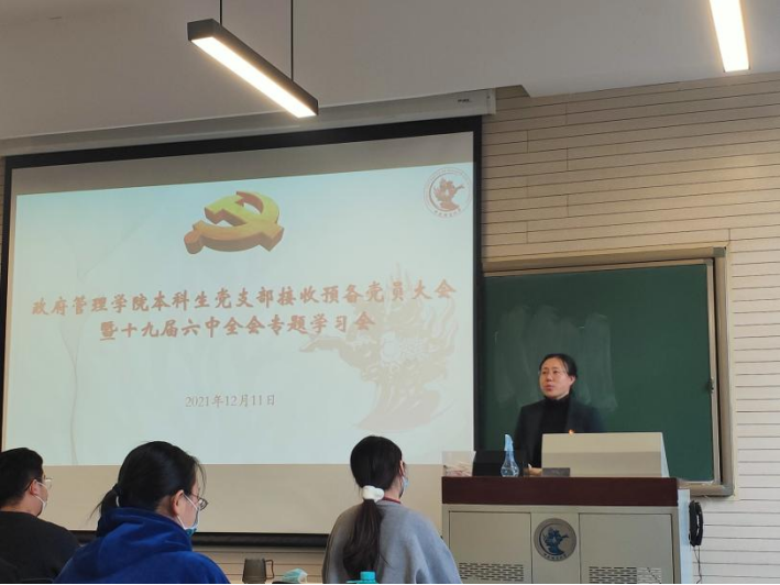 大会最后一项,本科生党支部书记李莎莉深刻剖析了学习十九届六中全会相关知识的重大意义,并梳理了历届全会的发展历程,用简洁明晰的语言生动的为同学们讲解了相关理论知识。李莎莉书记进一步强调了理论知识学习的重要性,希望同学们能端正自己的入党动机,深刻领悟党的重要精神思想,加强学习思考,锤炼党性意识,并积极用于指导自己的实际学习生活。