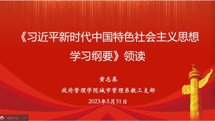 2023年5月31日中午12:30,bv伟德国际1946官网城市管理系教工党支部在线上开展《习近平新时代中国特色社会主义思想学习纲要》专题学习活动。支部书记陈红霞老师主持会议,支部委员黄志基老师主讲。