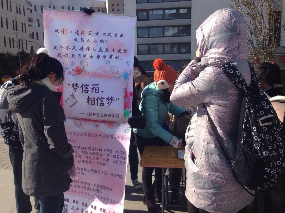短短两天里,在同学们的热情宣传下,现场氛围持续高涨。即使寒风阵阵,也抵不住同学们内心的那份感激,大家都陆陆续续前来,积极参与到此次活动中。在活动现场,有的同学拿着写好的明信片来邮递感恩,有的同学当场写下一片真挚感情,还有的同学积极学做DIY折纸,他们借助“梦信箱”这个平台将惊喜传递,将一片真情演绎得淋漓尽致。那一张张漂亮可爱的明信片,那一个个专注认真的神情,不仅展现了大家对此次活动的兴趣,也体现出当代老员工积极向上的良好风貌和一颗满怀感恩的赤子之心。