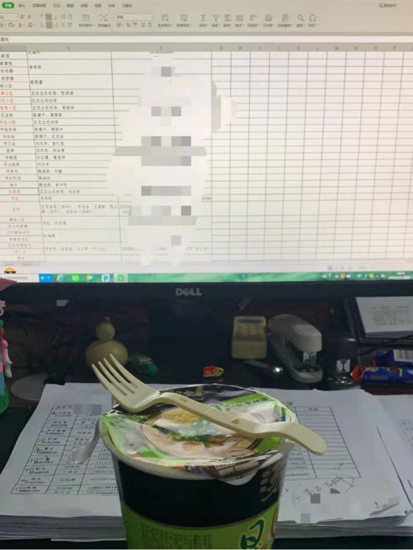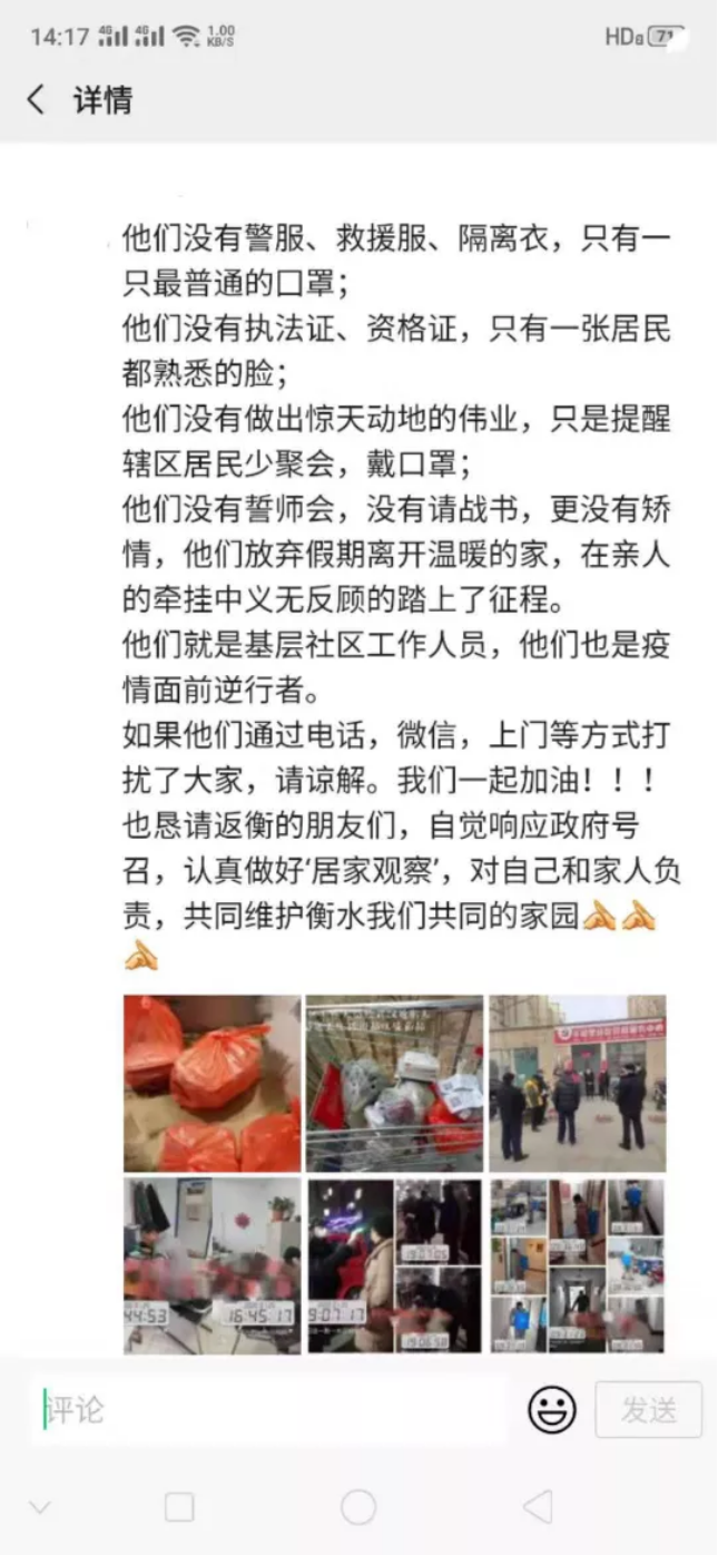 衡水有很多的老旧小区,没有物业,在处于统筹规划,合理配置的考虑下,她尽量安排本小区内群众坐班排查,24小时值班,并尽最大能力给予这些无名群众们物质支持。在此期间,由于加班熬夜,劳累过度,有许多工作人员生病了,但他们始终坚守岗位,我被触动了,自发给她当司机、当义工,这是我唯一能为她做的,我开始每天开车拉着她去检查这些监测点,中午晚上给我姐姐带来妈妈为她做的饭,不再让她吃泡面。另外在她分管的小区中有14个无物业的老旧小区,不过这些小区都设置了监测点,印象最深的是有一次是23点我开车去社区监测点,看着这些工作人员穿着大衣戴着口罩连个热水杯都没有的坐在大门口,心中的滋味是无法表达的,所以我留下来陪他们到凌晨4点才回家。