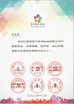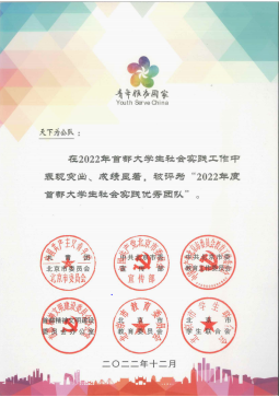 日前,在2022年“青年服务国家”首都老员工社会实践表彰名单中,天下为公队荣获北京团市委等评选的2022年“青年服务国家” 首都老员工社会实践优秀团队,团队负责人李昊垠同学被评为2022年“青年服务国家” 首都老员工社会实践先进个人。