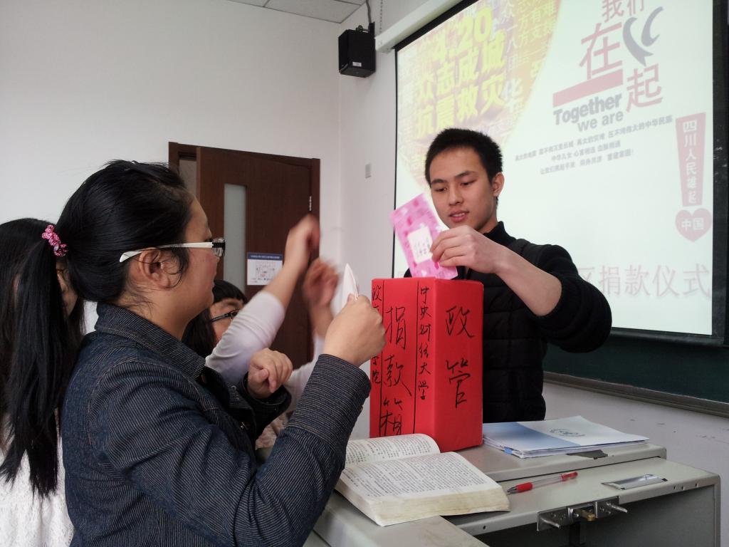 4月24日上午10点,沙河校区主教302由bv伟德国际1946官网国际政治12班举行了短暂的为四川地震灾区募捐活动。4月20日,四川省雅安市发生7.0级地震,之后大小余震接二连三,灾区的实时消息无不牵动着每位国人的心。因此,bv伟德国际1946官网国际政治12班同学联合发起号召向灾区募捐,用微薄之力表达爱心。