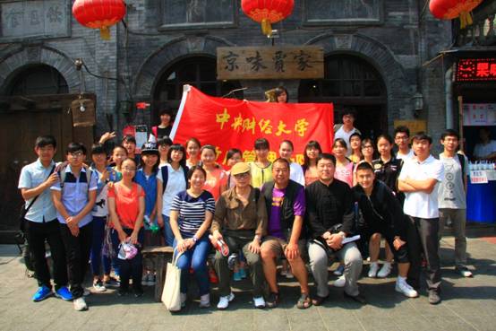 时间已到正午,在同学们饥肠辘辘之时,袁老先生又带给了大家惊喜,他带领着大家穿过老街,寻找“贾大爷”,又一位奇人,必定会有奇闻。“贾大爷”贾勇先生曾是一名北京举重运动员,现在是集摄影家、画家、民间外交家等“多家”于一身的奇人,在他的卤煮店,同学们吃到了正宗的京味,看到了关于老北京胡同变迁的的优秀摄影作品,听到了北京的市井文化,感受到了北京的魅力。袁先生在午餐时分告诉我们“做人最重要的是三力——体力、智力和意志力,体力和智力是有限的,意志力是无穷的,同学们一定要无限发掘自己的意志力,才会有充实的人生”,这句话同样被同学们铭记于心,作为自己的人生准则。美味的午餐结束后,同学们与“贾大爷”合影告别,继续大栅栏之旅。