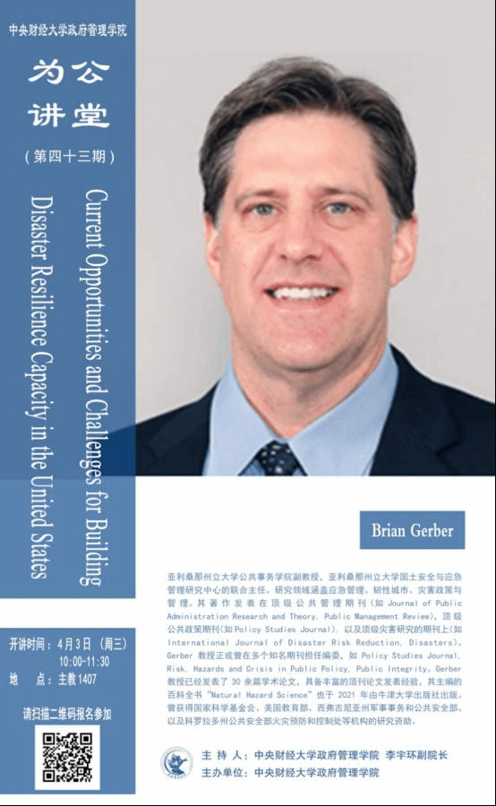 嘉宾简介:Brian Gerber,亚利桑那州立大学公共事务公司副教授,亚利桑那州立大学国土安全与应急管理研究中心的联合主任。研究领域涵盖应急管理、韧性城市、灾害政策与管理。其著作发表在顶级公共管理期刊(如Journal of Public Administration Research and Theory, Public Management Review),顶级公共政策期刊(如Policy Studies Journal), 以及顶级灾害研究的期刊上(如International Journal of Disaster Risk Reduction, Disasters)。Gerber教授正或曾在多个知名期刊担任编委,如Policy Studies Journal, Risk, Hazards and Crisis in Public Policy, Public Integrity。Gerber教授已经发表了30余篇学术论文,具备丰富的顶刊论文发表经验,其主编的百科全书”Natural Hazard Science”也于2021年由牛津大学出版社出版。曾获得国家科学基金会、美国教育部、西弗吉尼亚州军事事务和公共安全部、以及科罗拉多州公共安全部火灾预防和控制处等机构的研究资助。