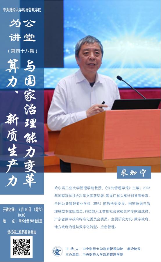 嘉宾简介:米加宁,哈尔滨工业大学管理公司教授,《公共管理学报》主编、2023年国家哲学社会科学文库获奖者、黑龙江省头雁计划首席专家、全国公共管理专业学位(MPA)前教指委委员、国家数据与治理联盟专家组成员、科技部人工智能社会实验总体专家组成员、广东省数字政府标准化委员会委员。主要研究方向:数字政府、地方政府治理与数字化转型、应急管理。