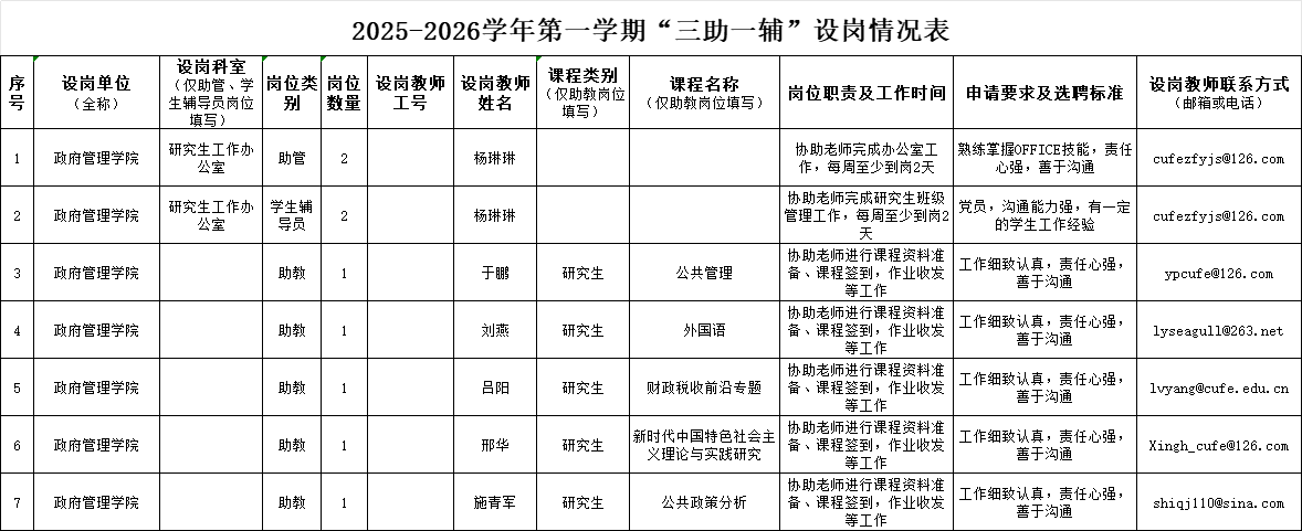 2025-2026学年第一学期“三助一辅”设岗情况表