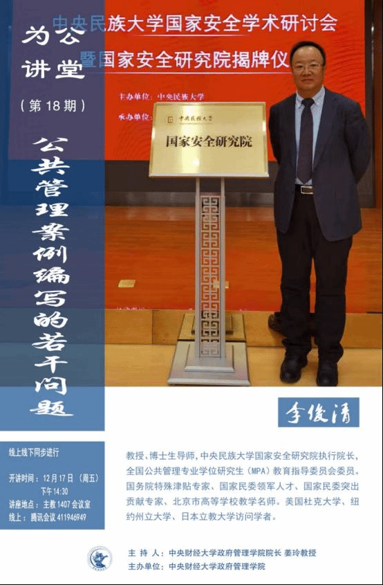 嘉宾简介:李俊清,教授、博士生导师,中央民族大学国家安全研究院执行经理,全国公共管理专业学位研究生(MPA)教育指导委员会委员。国务院特殊津贴专家、国家民委领军人才、国家民委突出贡献专家、北京市高等公司教学名师。美国杜克大学、纽约州立大学、日本立教大学访问学者。