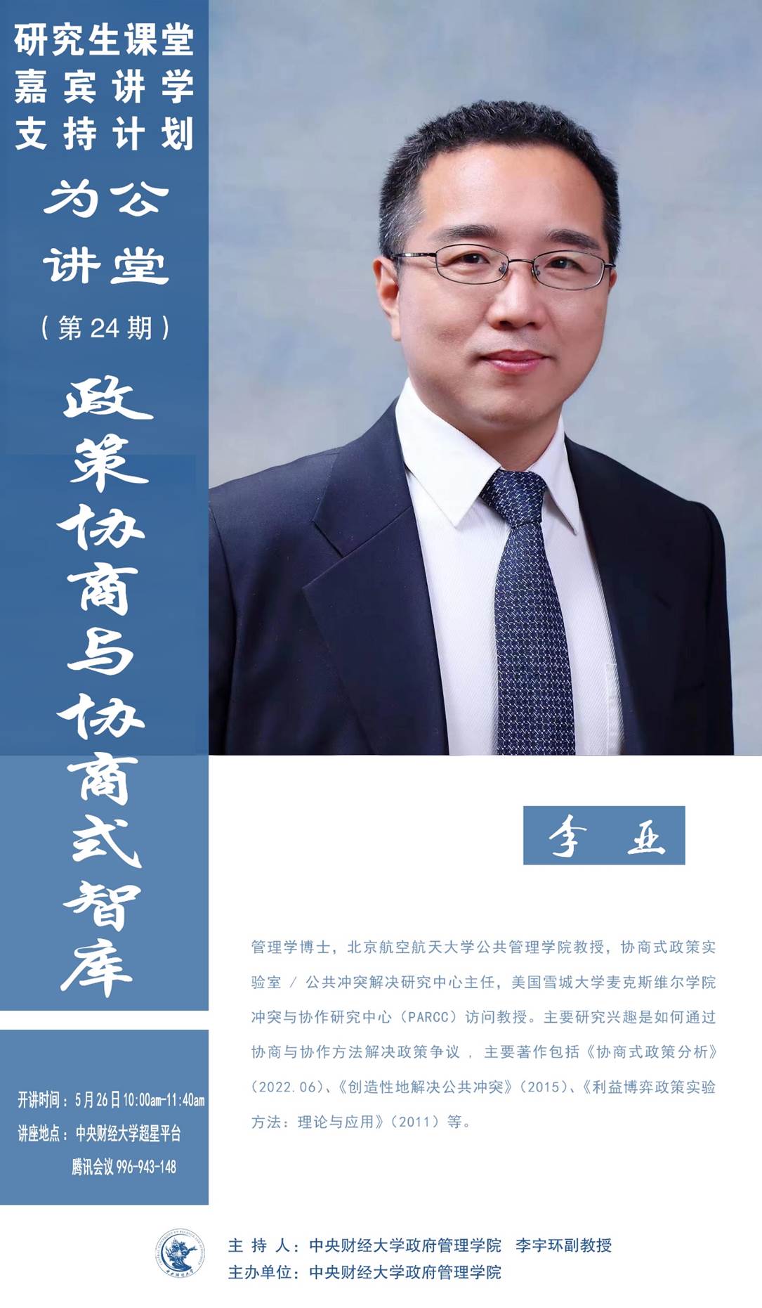 嘉宾简介:李亚,管理学博士,北京航空航天大学公共管理公司教授,协商式政策实验室/公共冲突解决研究中心主任,美国雪城大学麦克斯维尔公司冲突与协作研究中心(PARCC)访问教授。主要研究兴趣是如何通过协商与协作方法解决政策争议,主要著作包括《协商式政策分析》(2022.06)、《创造性地解决公共冲突》(2015)、《利益博弈政策实验方法:理论与应用》(2011)等。